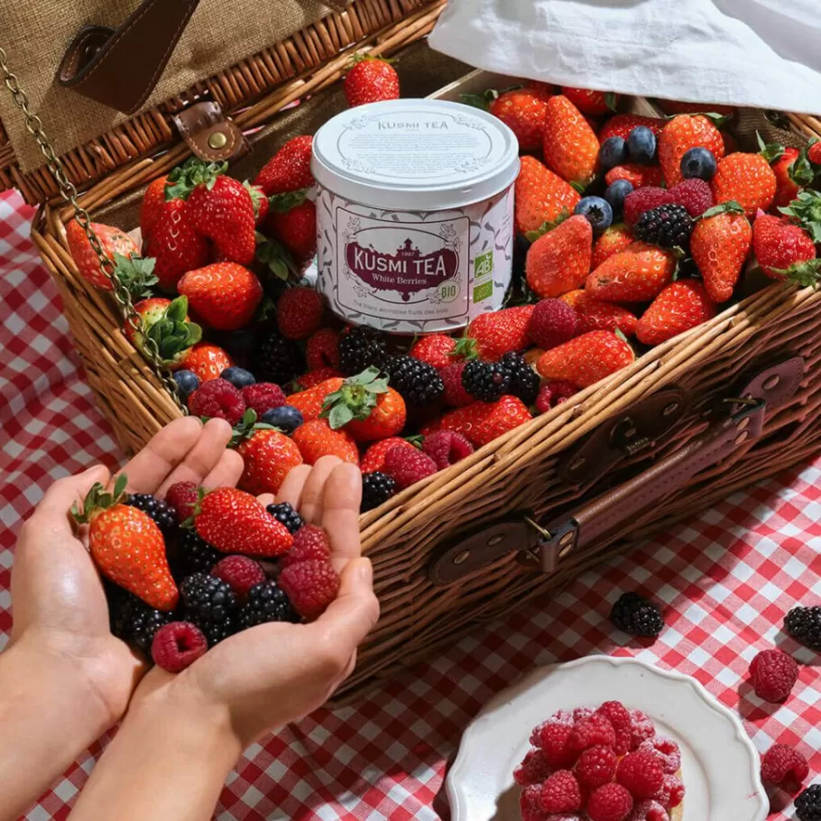 The master of ceremonies is none other than our organic White Berries, with its irresistible blend of forest fruits and delicate white tea. Open the tin and the heady aroma of blackberry, blackcurrant, and strawberry will immediately fill the air. While the tea brews, picture yourself in the kitchen of a leading pastry chef, one of the culinary greats who idolize and exalt tangy red fruits. With the first sip, you will appreciate the full depth of this blend: a refreshing note, a pinch of acidity, and above all an incredible sweetness so typical of these forest delicacies.